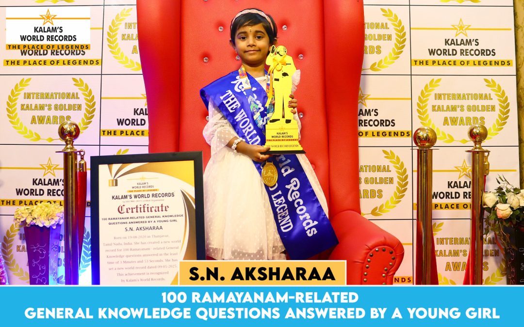 Born on 19-08-2020 in Thanjavur, Tamil Nadu, India. She Has Created a New World Record for 100 Ramayanam-related General Knowledge Questions Answered in the Least Time of 3 Minutes and 53 Seconds. She Has Set a New World Record Dated 09-05-2025. This Achievement is Recognized by Kalam’s World Records.