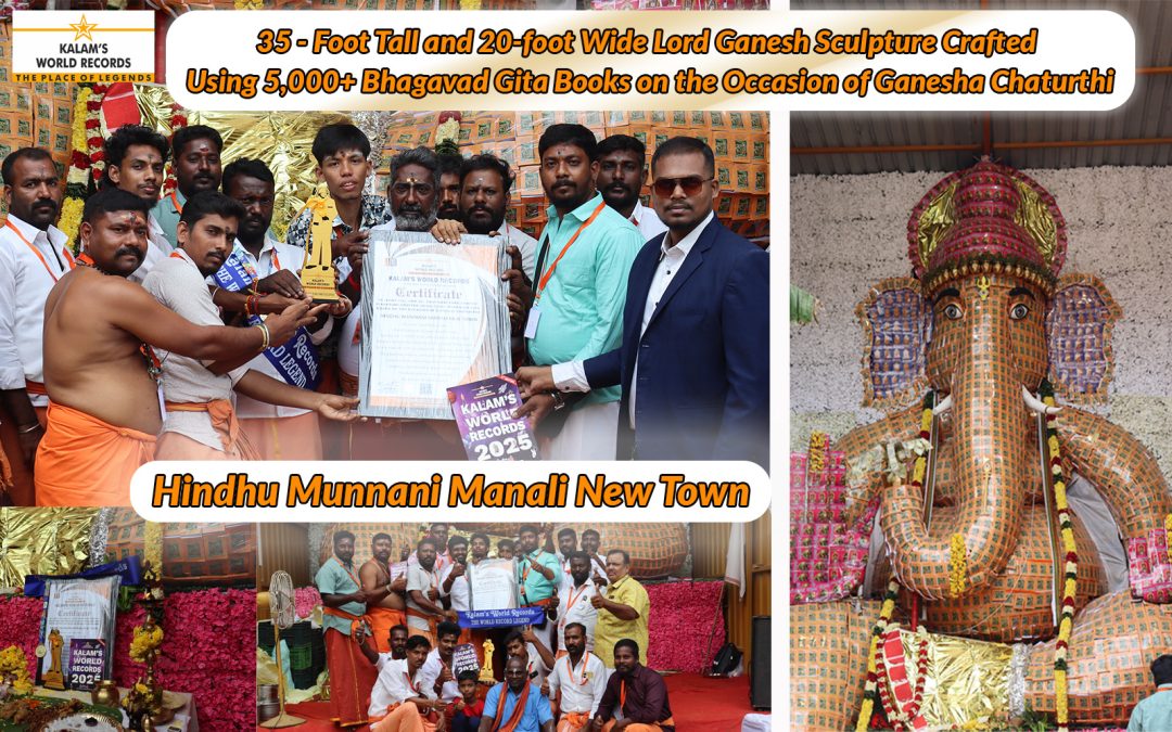 Chennai, Tamil Nadu, India, Has Organized a Group World Record Attempt for 35 – Foot Tall and 20-foot-wide Lord Ganesh Sculpture Crafted Using 5,000+ Bhagavad Gita Books on the Occasion of Ganesha Chaturthi. The Team Successfully Participated and Completed the Group World Record Attempt With 40 and Above Members. This record is dated 27-08-2025.