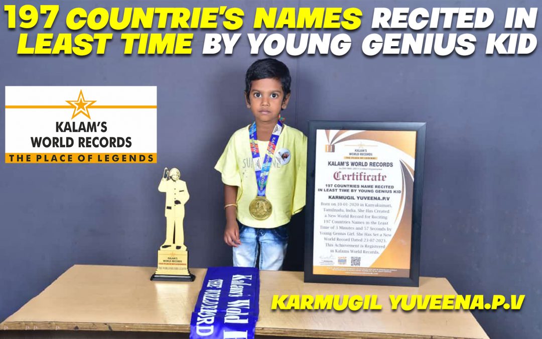 Born on 10-01-2020 in Kanyakumari, Tamilnadu, India.she Has Created a New World Record for Reciting 197 Countries’ Names in the Least Time of 3 Minutes and 57 Seconds by Young Genius Girl. She Has Set a New World Record Dated 23-07-2023. This Achievement is Registered in Kalams World Records.