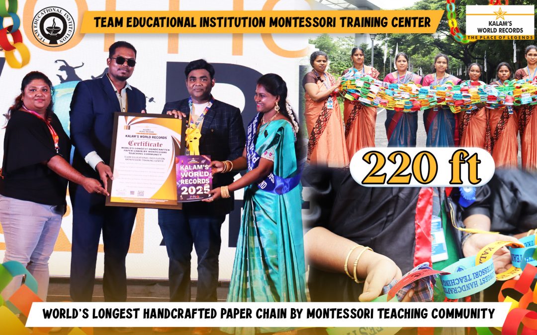 Team Educational Institution Montessori Training Center Chennai, Tamil Nadu, India Has Organized a Group World Record Attempt for 220 Feet of the World’s Longest Handcrafted Paper Chain by the Montessori Teaching Community. The Team Successfully Participated and Completed the Group World Record Attempt With 500 and Above Participants. This Record is Dated 25-10-2025. Venue: Anna Centenary Library, Chennai. This Achievement is Recognized by Kalam’s World Records.