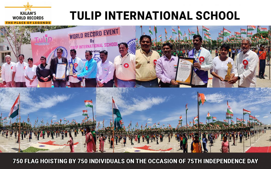 TULIP INTERNATIONAL SCHOOL Arani, Tamilnadu, India has organised a group world record attempt on 13-08-22 by hoisting 750 flags with 750 members simultaneously in the Tulip International school campus on the occasion of 75th Independence day. The record is organized By Mrs Revathi Kalaiselvan and this achievement is registered in Kalam’s World Records.
