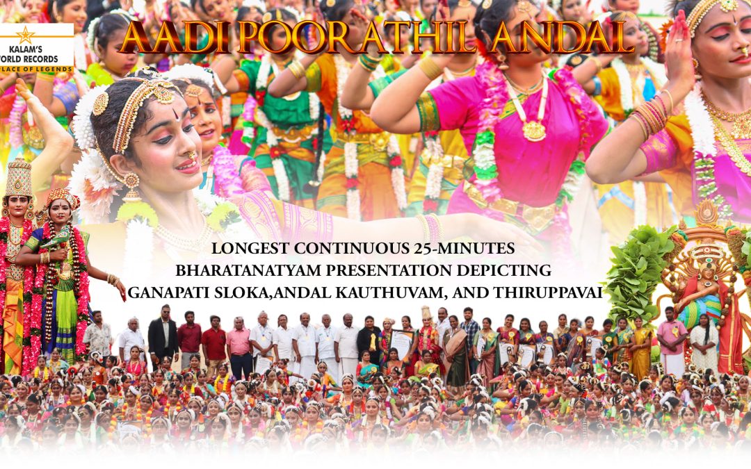 AADI POORATHIL ANDAL LONGEST CONTINUOUS 25-MINUTES BHARATANATYAM PRESENTATION DEPICTING GANAPATI SLOKA, ANDAL KAUTHUVAM, AND THIRUPPAVAI.