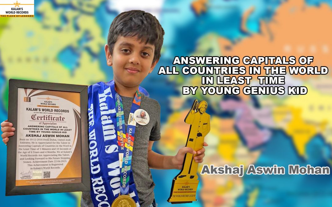 Born On 10-12-2016 In Dubai, United Arab Emirates. He Is Appreciated For His Talent In Answering Capitals Of Countries In The Word In The Least Time Of 5 Minutes And 10 Seconds At The Age Of 6 Years And 4 Months. we At Kalam’s World Records Are Appreciating His Talent, And Looking Forward To His Future Stepping Stones.