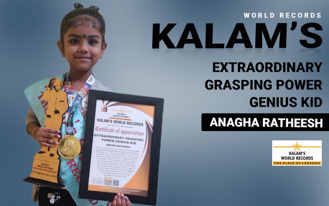 ANAGHA RATHEESH Born on 26-10-2017 from Alappuzha, Kerala, India is appreciated for Identifying and Reciting different topics like 124- general knowledge, 22 state, 7-fish, 13-human body, 20-birds, 9- snake, 20-national symbols, 8-Kerala symbols, 49-animal related,...