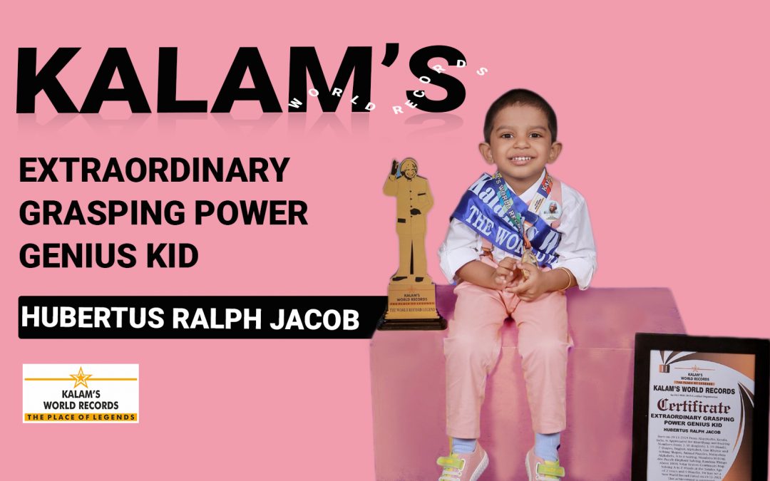 HUBERTUS RALPH JACOB born on 29-11-2018 from Alappuzha, Kerala, India, is appreciated for Identifying and Reciting numbers from 1-30 (English), 1-10 (Hindi), 6 colors, 7 shapes, English alphabet, one rhyme; and solving shapes and animal puzzles, Malayalam alphabets, A...