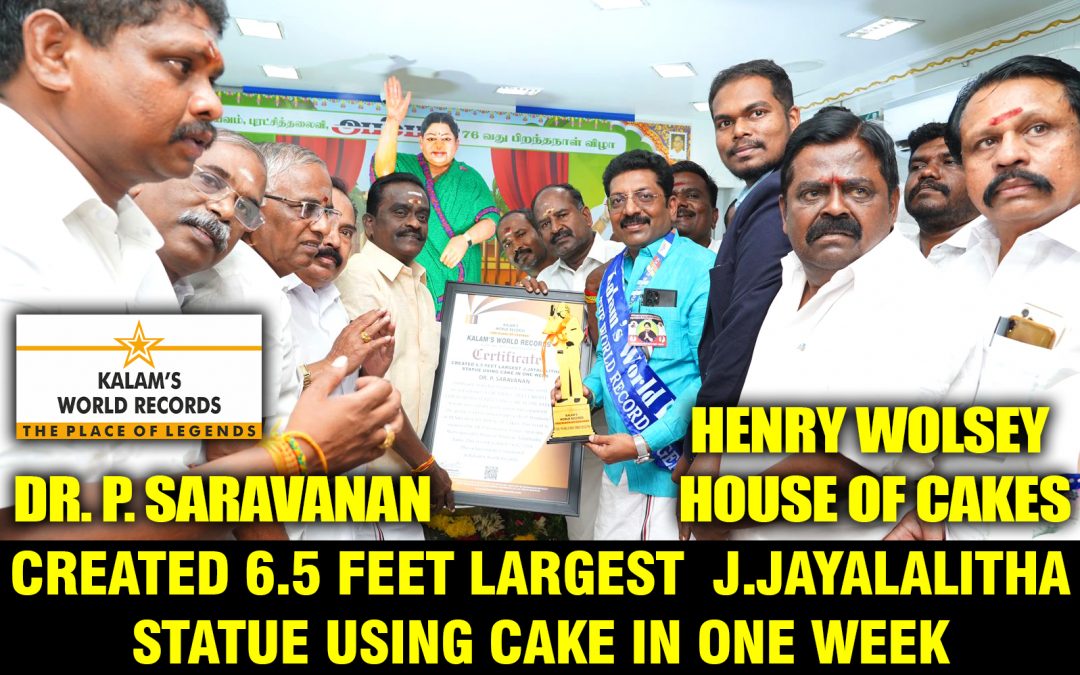 Tamilnadu, India Has Organised a Group World Record Attempt of Created 6.5 Feet Largest J.jayalalitha Statue Using Cake .a Team Successfully Participated and Completed the Group World Record Attempt With 10 Members of Henry Wolsey House of Cakes. This event is Organised by Dr. P. Saravanan Venue: Saravana Multi-speciality Hospital Madurai, Tamil Nadu, India. This Record is Dated 24-02-2024. This achievement is Registered in Kalam’s World Records.