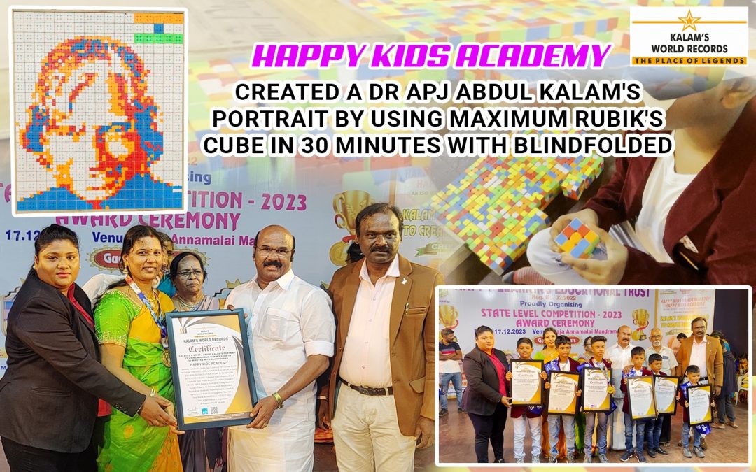 Chennai, Tamilnadu, India Has Created a New Group World Record “Created a Dr. APJ Abdul Kalam’s Portrait by Using Maximum Rubik’s Cube in 30 Minutes With Blindfolded”. Happy Kids Academy Students Had Successfully Participated With 06 Participants. They Set a New World Record Dated on 17-12-2023. This Achievement is Registered in Kalam’s World Records.