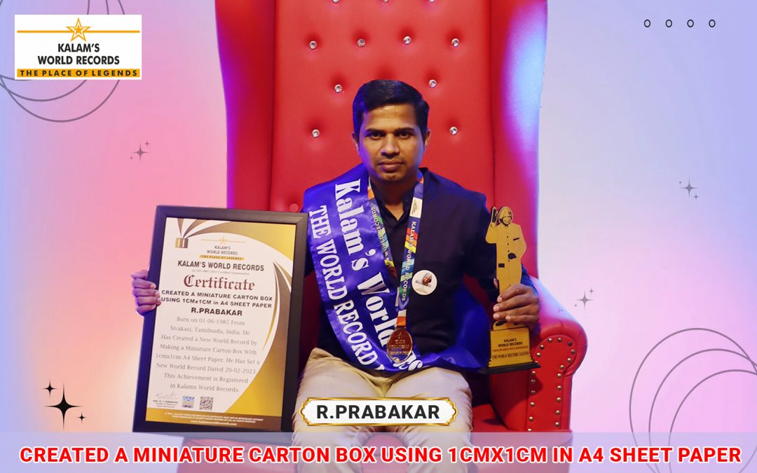 Born on 01-06-1985 From Sivakasi, Tamilnadu, India. He Has Created a New World Record by Making Miniature Carton Box With 1cm*1cm A4 Sheet Paper. He Has Set a New World Record Dated 20-02-2023. This Achievement is Registered in Kalams World Records.