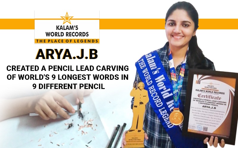 Born on 05-01-1998 from Thiruvananthapuram, Kerala, India. She has created a New World Record by Carving the 9 longest words on 9 Different Pencil leads. She set a New World Record Dated on 23-07-2021. This Achievement is Registered in Kalam’s World Records.