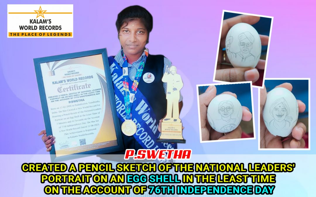 Born on 12-02-2006 in Pudukkottai, Tamilnadu, India. She Has Created a New World Record for Drawing a Pencil Sketch of the National Leaders’ Portrait on an Egg Shell in the Least Time of 7 Minutes and 42 Seconds on the Account of 76th Independence Day. She Has Set a New World Record Dated 11-08-2023. This Achievement is Registered in Kalams World Records.