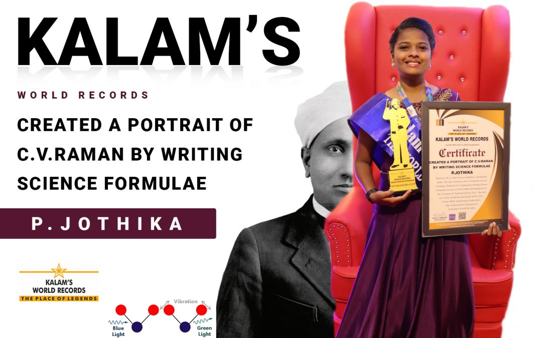 Born on 28-12-2000 from Cuddalore, Tamilnadu, India. She has created a new world record by creating a portrait of C.V.Raman by writing Science Formulae in size of 50ft X 80ft and displayed on the occasion of “National Science Day”. She has set a new world record dated 28-02-2022. Venue: MVIT Auditorium, Puducherry. This achievement is registered in Kalam’s world records.