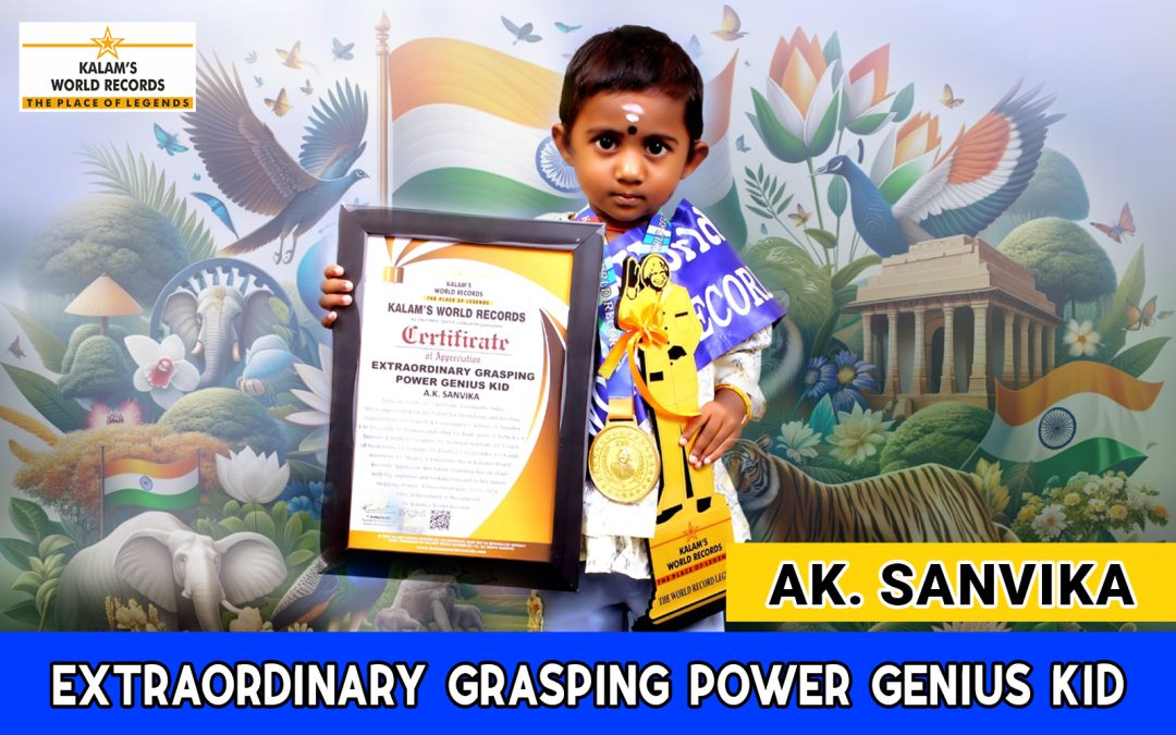 Born on 19-06-2022 in Erode, Tamilnadu, India. She is Appreciated for Her Talent for Identifying and Reciting, Tamil Letters 30 ( Vowels & Consonants ), Actions 9, Number 1 to 10, Cards 10, Flowers and Other 11, Body Parts 9, Vehicles 8, Animals & Birds 10, Leaders 10, National Symbols 10, Variety of Food Items 14, Colours 10, Fruits 13, Vegetables 12, Family Members 10, Shapes 4, Emotions. We at Kalam’s World Records Appreciate Her Talent, Honoring Her on Stage With Big Applause and Looking Forward to Her Future Stepping Stones. Achievement Date 22-05-2024.