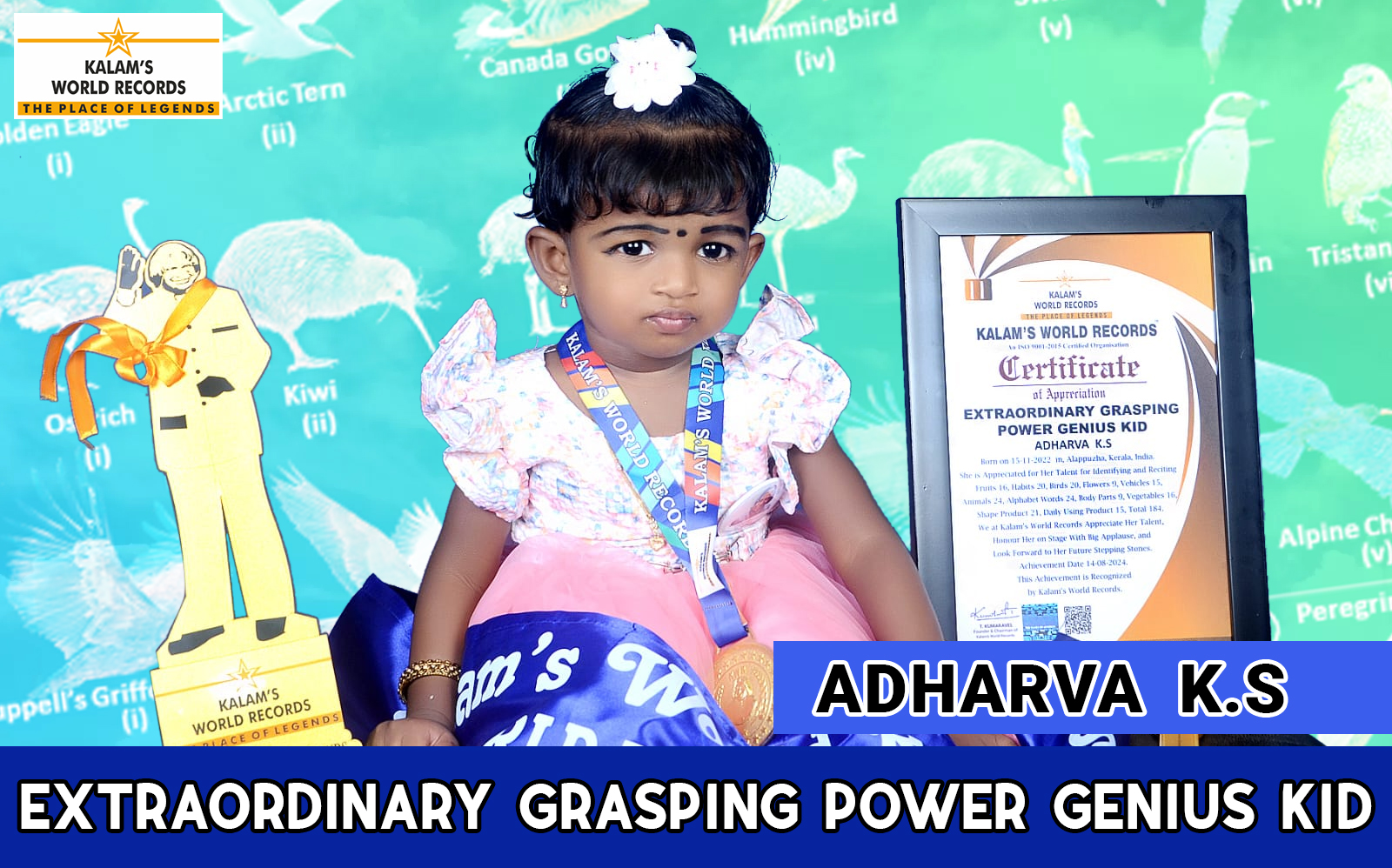 Born on 15-11-2022 in, Alappuzha, Kerala, India. She is Appreciated for Her Talent for Identifying and Reciting Fruits -16, Habits -20, Birds – 20, Flowers -9,