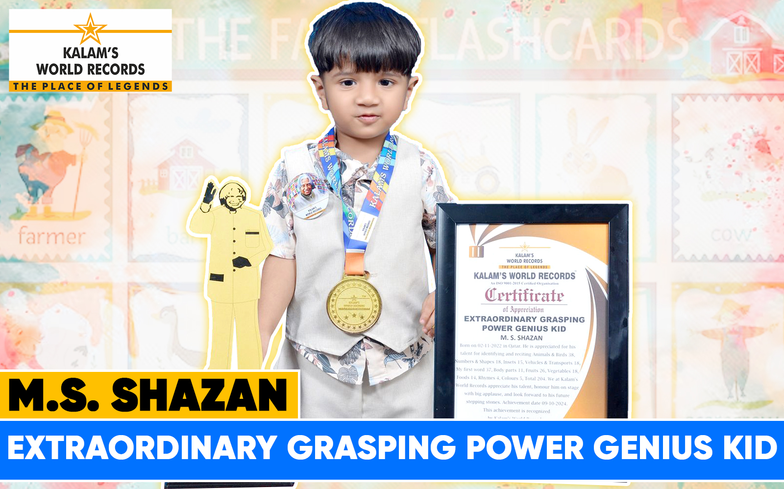 Born on 02-11-2022 in Qatar. He is Appreciated for His Talent for Identifying and Reciting Animals & Birds 38, Number & Shapes 18, Insets 15, Vehicle & Transport 18, My First Word 37, Body Parts 11, Fruits 26, Vegetables 18, Food 14, Rhymes 4, Colours 5, Total 204. We at Kalam’s World Records Appreciate His Talent, Honour Him on Stage With Big Applause, and Look Forward to His Future Stepping Stones. Achievement Date 09-10-2024 . This Achievement is Recognized by Kalam’s World Records.