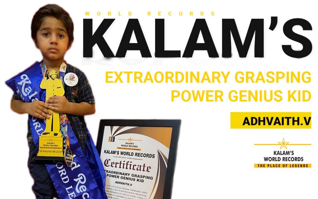 Born on 12-01-2019 from Chennai, Tamilnadu, India. He has created a New World Record by Identifying and Reciting Alphabets 26 with its words, Colors 12, Shapes 10, Fruits 23, Vegetables 23, Food 21, Transport33, Wild animals 19, Parts of Body 19, Living room , Appliances, Tamil months 12, weekdays 7, Fruits and Vegetables, English months 12, Rhymes, numbers 1 to 20, God slogans 7 in Sanskrit,Thirukkural 8 in Athigaram 1. He has set a New World Record Dated on 10-10-2021. This Achievement is registered in Kalam’s World Records.