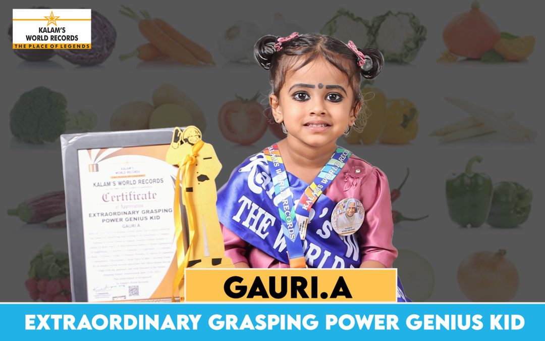 8 Gk, 12 Shapes Sorting, 8 Action Words in English, Vowels, Animal Sounds 3, 2 Birds, 12 Body Parts, 26 Miscellaneous, 10 Home Appliances, 14 Food Items, 5 Universe,13 Animals, 13 Vegetables, 12 Vehicles, 11 Birds, 12 Fruits, 5 Gods, 10 Famous Persons, 10 Spices, 6 Cosmetics, 5 Ornaments, 5 Electronics, 5 Body Parts in Bird, 5 Kitchen Tools. We at Kalam’s World Records Appreciate Her Talent, Honor Her on Stage With Big Applause, and Look Forward to Her Future Stepping Stones. Achievement Date 17-02-2025. This Achievement is Recognized by Kalam’s World Records.