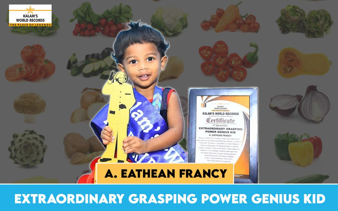 Born on 31-08-2023 in Tenkasi, Tamil Nadu, India. She is Appreciated for Her Talent for Identifying Animals 13, Birds 13, Food Items 19, Fruits 7, Vegetables 16, School Things 9, Vehicles 8, Body Parts 10, National Leaders 3, Animals Sound 5, Month 7, Week 7, Basic Things 30,n Umbers 5. We at Kalam’s World Records Appreciate Her Talent, Honor Her on Stage With Big Applause, and Look Forward to Her Future Stepping Stones. Achievement Date 18-02-2025. This Achievement is Recognized by Kalam’s World Records.