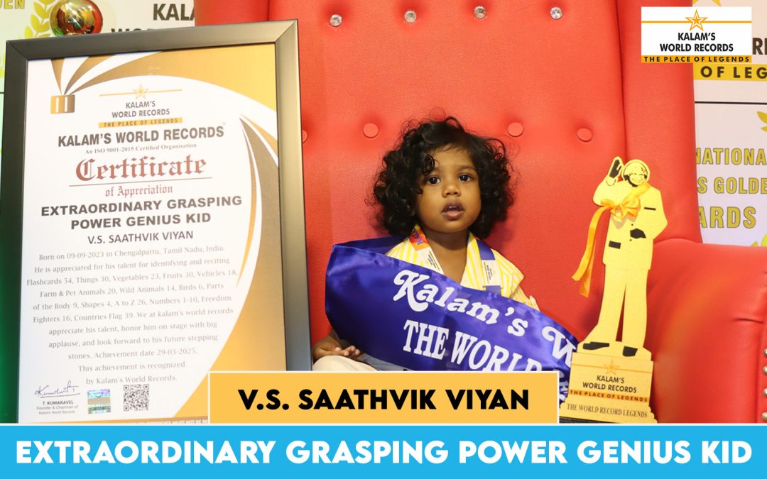 Born on 09-09-2023 in Chengalpattu, Tamil Nadu, India. He is Appreciated for His Talent for Identifying and Recitingflashcards 54, things 30, vegetables 23, fruits 30, vehicles 18, farm & Pet Animals 20,w ild Animals 14, birds 6, parts of the Body 9, shapes 4, a to Z 26, numbers 1-10, Freedom Fighters 16, countries Flag 39. We at Kalam’s World Records Appreciate His Talent, Honor Him on Stage Witha Big Applause, and Look Forward to His Future Stepping Stones. Achievement Date:29-03-2025. This Achievement is Recognized by Kalam’s World Records.