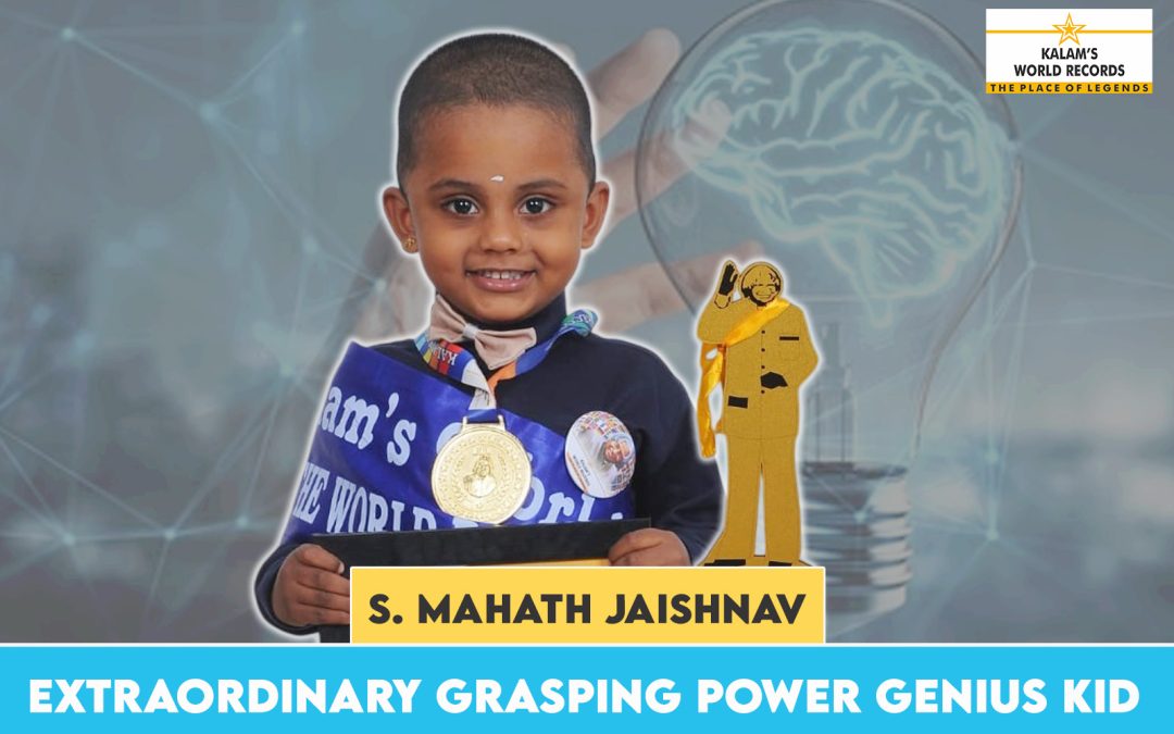 Born on 21-06-2022 in Kanniyakumari, Tamil Nadu, India. He is Appreciated for His Talent for Identifying and Reciting Country Flags 150, Tamil Letters 247, Math Numbers (0-1000), English Alphabet 26, Solar System Planets 8, Kannada Letters 15, Hindi Letters 13, Days of Week 7, English Months 12, Tamil Months 12, Animals 18, Colors 16, Shapes 23, Sea Animals 11, Vehicles 14, Vegetables 20, Fruits 17, Birds 13, Parts of Body 14, Animal Sounds 16, National Symbols 8, Insects 13, Rainbow Colors 7. We at Kalam’s World Records Appreciate His Talent, Honor Him on Stage With Big Applause, and Look Forward to His Future Stepping Stones. Achievement Date 11-05-2025. This Achievement is Recognized by Kalam’s World Records.