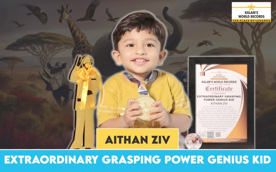 11 Wild Animals, 10 Colours, 8 Shapes, 8 Birds, 7 Body Parts, 7 Farm Animals, 5 Famous People, 4 Country Flags, Months in the Year 12, Days of the Week 7, 26 English Alphabet, Counting From 1-10 Numbers. We at Kalam’s World Records Appreciate His Talent, Honor Him on Stage With Big Applause, and Look Forward to His Future Stepping Stones. Achievement Date 05-06-2025. This Achievement is Recognized by Kalam’s World Records.