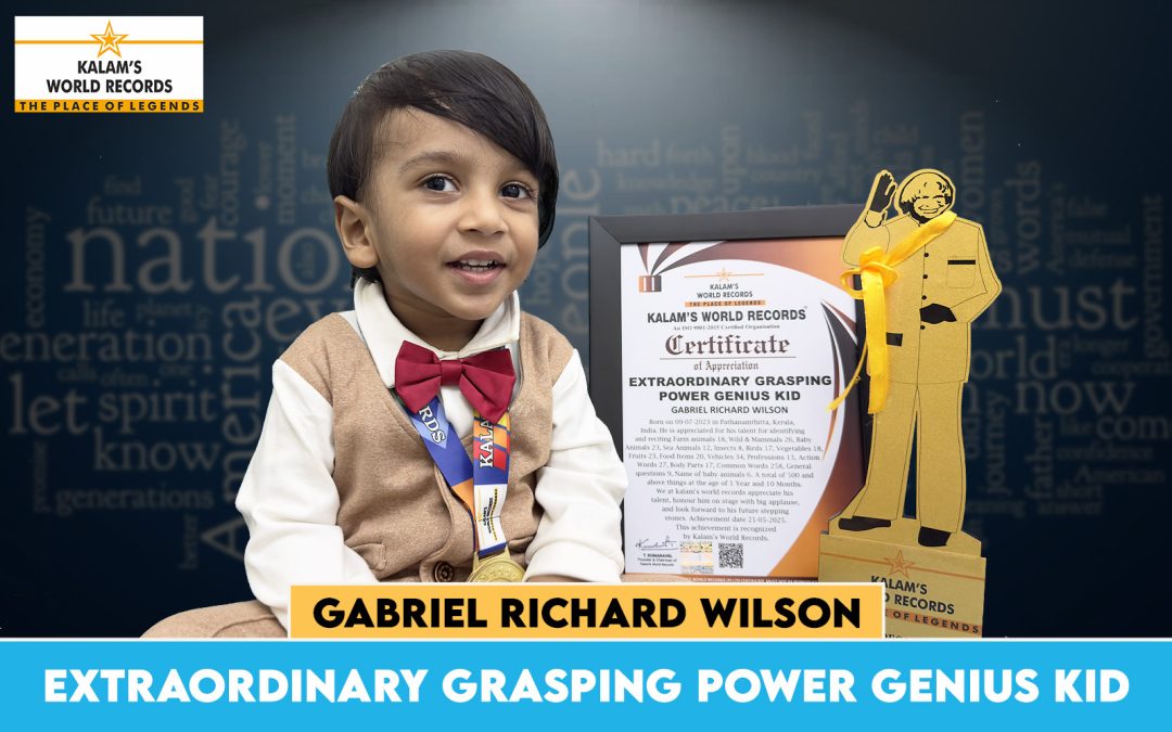 Born on 09-07-2023 in Pathanamthitta, Kerala, India. He is Appreciated for His Talent for Identifying and Reciting Farm Animals 18, Wild & Mammals 26, Baby Animals 23, Sea Animals 12, Insects 8, Birds 17, Vegetables 18, Fruits 23, Food Items 20, Vehicles 34, Professions 13, Action Words 27, Body Parts 17, Common Words 258. General Question 9, Name of Baby Animals 6. A Total of 500 and Above Things at the Age of 1 Year and 10 Months. We at Kalam’s World Records Appreciate His Talent, Honour Him on Stage With Big Applause, and Look Forward to His Future Stepping Stones. Achievement Date 21-05-2025. This Achievement is Recognized by Kalam’s World Records.