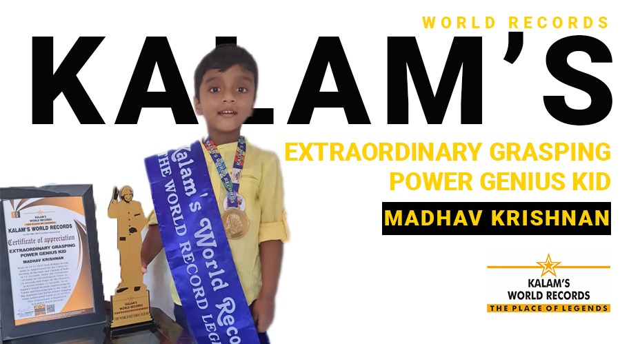 Born on 29-12-2016 from Kollam, Kerala, India is Appreciated for his Talent by Reciting all the state and capitals of india in 53 seconds, name the Presidents of India in chronological order in 18 seconds and Name all the Districts in Kerala within 11 seconds. As we Kalam’s World Records Appreciating his Talent and Honoring him in the stage of Big Applause and for his Future stepping stone. Achievement Dated on 22-10-2021. This Achievement is Registered in Kalam’s World Records.