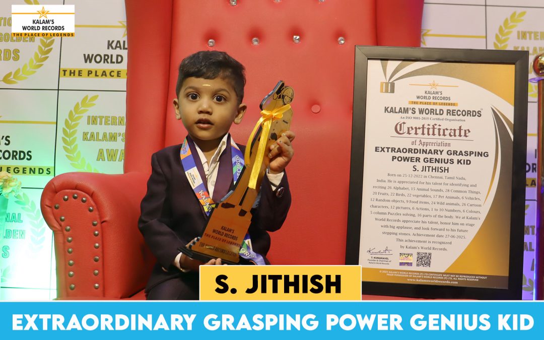 Born on 25-12-2022 in Chennai, Tamil Nadu, India. He is Appreciated for His Talent for Identifying and Reciting 26 Alphabet, 15 Animal Sounds, 28 Common Things, 20 Fruits, 22 Birds, 22 Vegetables, 17 Pet Animals, 6 Vehicles, 12 Random Objects, 9 Food Items, 24 Wild Animals, 26 Cartoon Characters, 12 Pictures, 6 Actions, 1 to 10 Numbers, 6 Colours, 5 Column Puzzles Solving, 16 Parts of the Body. We at Kalam’s World Records Appreciate His Talent, Honor Him on Stage With Big Applause, and Look Forward to His Future Stepping Stones. Achievement Date 27-06-2025. This Achievement is Recognized by Kalam’s World Records.