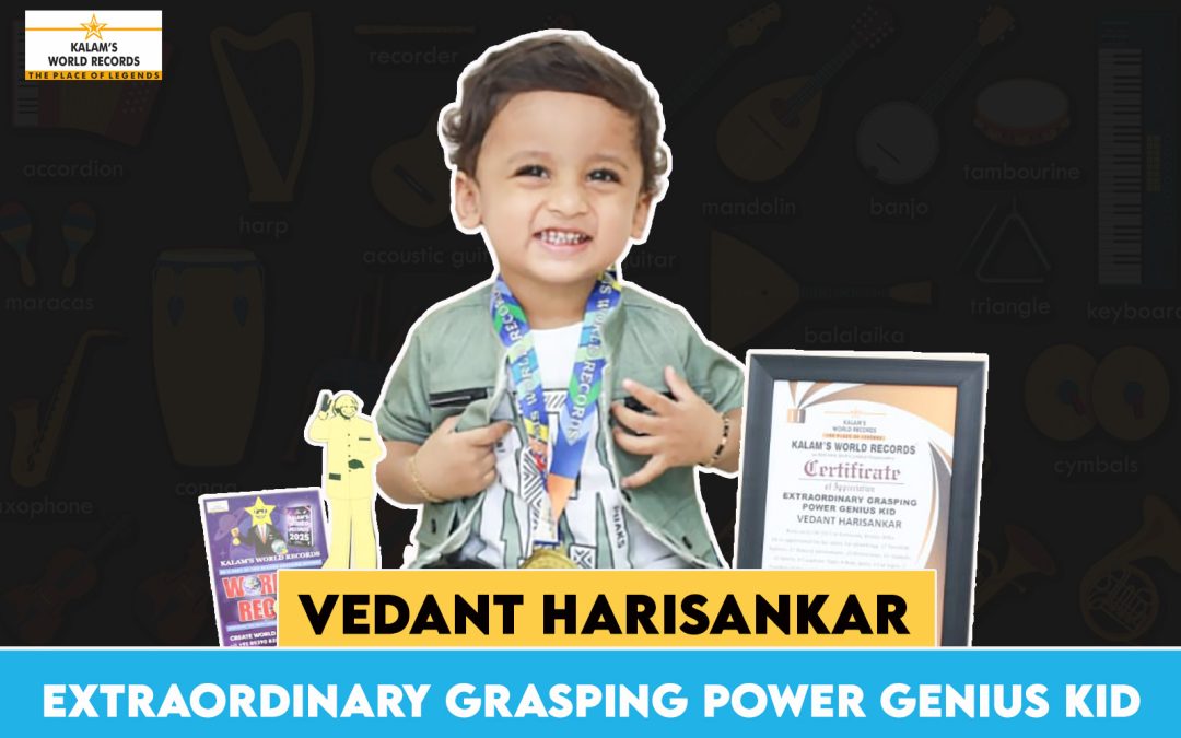 Born on 01-09-2023 in Kottayam, Kerala, India. He is Appreciated for His Talent for Identifying 27 Freedom Fighters, 17 Musical Instruments, 16 Professions, 19 Animals, 10 Sports, 8 Countries’ Flags, 8 Body Parts, 5 Car Logos, 5 Wonders of the World, 5 Animals and Their Babies, 4 Colours. We at Kalam’s World Records Appreciate His Talent, Honor Him on Stage With Big Applause, and Look Forward to His Future Stepping Stones. Achievement Date 05-06-2025. This Achievement is Recognized by Kalam’s World Records.