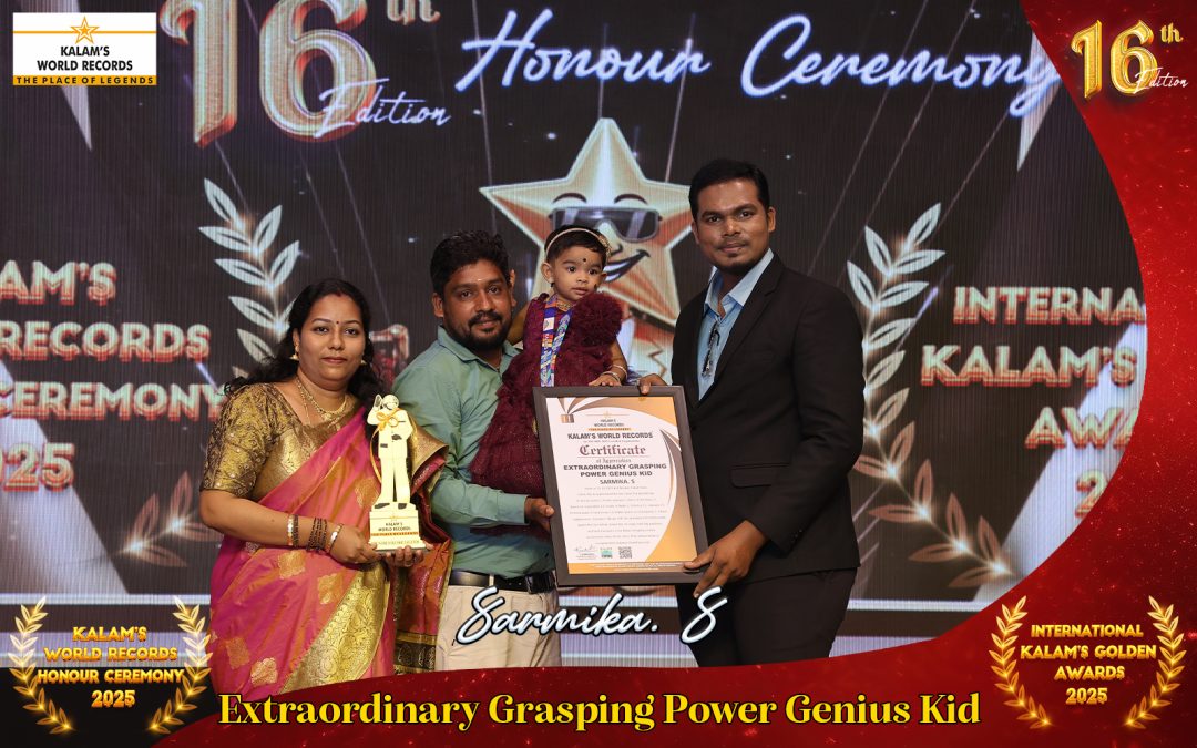 SARMIKA. S Born on 26-10-2023 in Chennai, Tamil Nadu, India. She is appreciated for her talent for identifying of Action words 3, Water animals 2, Parts of the body 11, Insects 6, Vegetables 12, Fruits 4, Birds 5, Vehicles 11, Animals 17, Professionals 3, Food items 14, Public places 4, Ornaments 2, Home appliances 6, Common Things 100. We at Kalam’s World Records appreciate her talent, honor her on stage with big applause, and look forward to her future stepping stones. Achievement date 06-09-2025. This achievement is recognized by Kalam’s World Records.