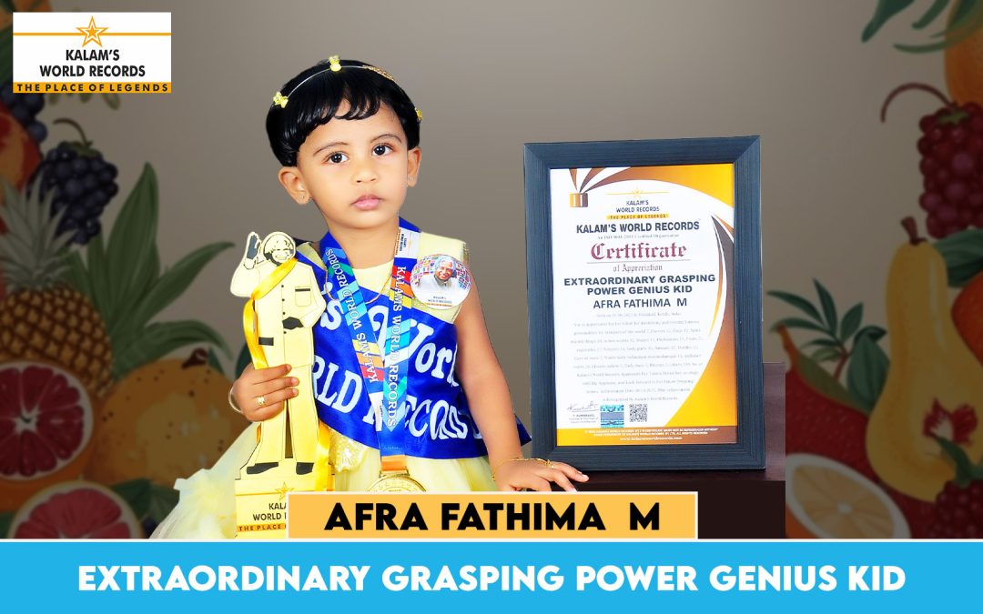 Flowers 12, Flags 12, Space-related things 10, Action words 32, Shapes 11, Professions 10, Fruits 25, Vegetables 27, Vehicles 24, Body parts 30, Animals 37, Months 12, Days of week 7, Words with malayalam swaraksharagal 15, Alphabet words 26, Qurans suhras 5, Daily duas 5, Rhymes 5, others 119. We at Kalam’s World Records appreciate her Talent, honor her on stage with Big Applause, and look forward to her Future Stepping Stones. Achievement Date 08-10-2025. This achievement is Recognized by Kalam’s World Records.