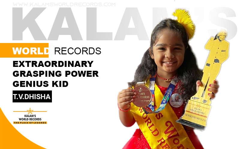 Born on 17-03-2018 from Chengam, Thiruvannamalai, Tamilnadu, India is appreciated for her talent by Identifying and Reciting 43 Proverbs from english to tamil, Parts of Rocket, States in India Map, five Great Epics, sings National Anthem, Colours, five kinds of Lands, 10 Capitals of Countries,15 Fruits ,13 Medicinal plants,20 Foods. As we Kalam’s World Records appreciating her talent and honouring her in the stage of big applause and for her future stepping stone.