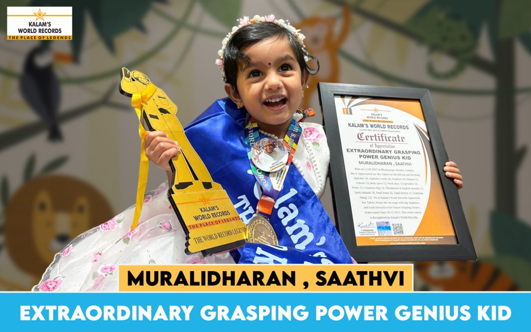 Born on 12-09-2023 in Mississauga, Ontario, Canada. She is Appreciated for Her Talent for Identifying and Reciting Alphabet 26, Alphabet Words 20, Numbers 20, Shapes 12, Colours 10, Body Parts 15, Week Days 7,vegetables 23, Fruits 15, Countries Flag 10, Thirukkural 8, English Months 12, Farm Animals 20,food Items 20, Tamil Letters 12, Common Things 132. We at Kalam’s World Records Appreciate Her Talent, Honor Her on Stage With Big Applause, and Look Forward to Her Future Stepping Stones. Achievement Date 30-12-2025. This Achievement is Recognized by Kalam’s World Records. World Records