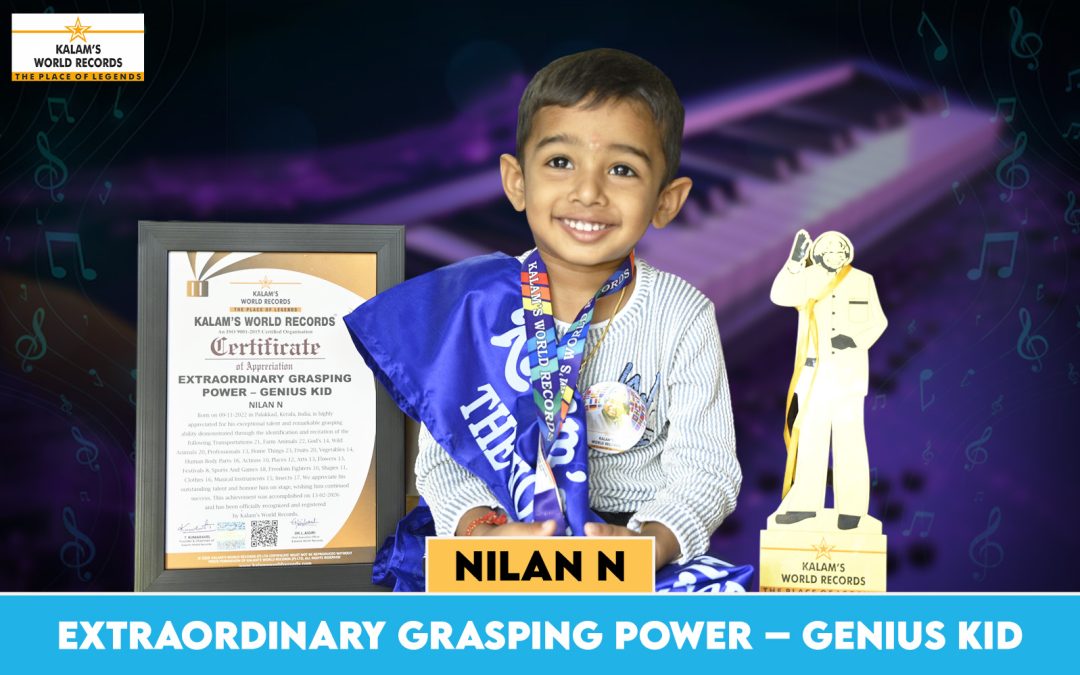 Born on 09-11-2022 in Palakkad, Kerala, India, is Highly Appreciated for His Exceptional Talent and Remarkable Grasping Ability Demonstrated Through the Identification and Recitation of the Following Transportations 21, Farm Animals 22, God’s 14, Wild Animals 20, Professionals 13, Home Things 23, Fruit 20, Vegetables 14, Human Body Parts 16, Actions 10, Places 12, Arts 13, Flowers 13, Festivals 8, Sports and Games 18, Freedom Fighters 10, Shapes 11, Clothes 16, Musical Instruments 15, Insects 17. We Appreciate His Outstanding Talent and Honour Him on Stage, Wishing Him Continued Success. This Achievement Was Accomplished on 13-02-2026 and Has Been Officially Recognized and Registered by Kalam’s World Records.