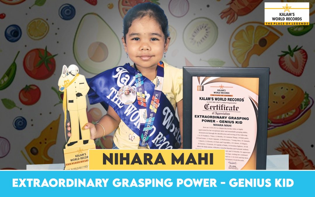 Born on 13-04-2023 in Alappuzha, Kerala, India, is highly appreciated for her exceptional talent and remarkable grasping ability, demonstrated through the identification and reciting of the following 1 to 20 Numbers, 7 Days, 12 Months, 50 Common Things, 18 Body parts, 20 Food items, 12 Water Animals, 14 Professions, 7 Young Ones, 50 Animals, 5 Insects, 12 Flowers, 45 Fruits and Vegetables, 10 Colours, 10 Shapes, 10 Nature, 5 Festivals, 10 Capitals of India, 10 Freedom Fighters, 18 GK about the India nation, 4 Rhymes, Gayathri Manthra and National Anthem. Total 350 and above words at the age of 2 years and 10 Months. We appreciate her outstanding talent and honour her on stage, wishing her continued success. This achievement was accomplished on 11-02-2026 and has been officially recognized and registered by Kalam’s World Records.