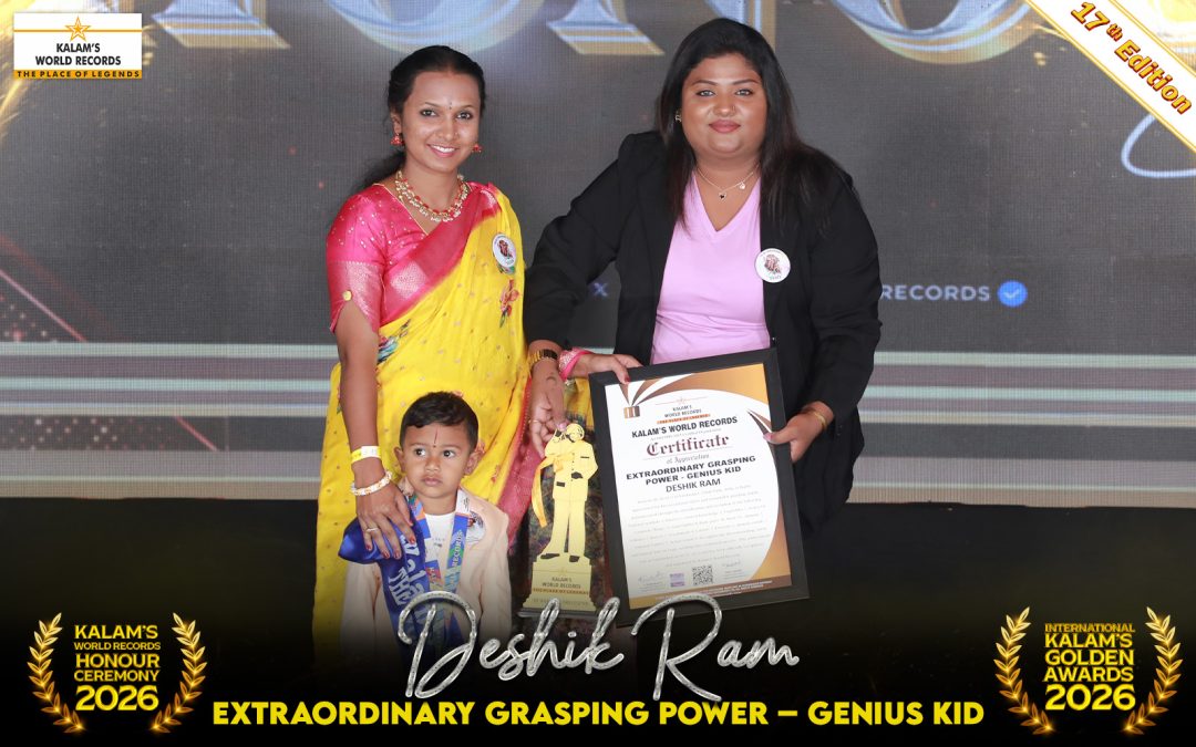 Born on 08-10-2023 in Krishnagiri, Tamil Nadu, India, is Highly Appreciated for His Exceptional Talent and Remarkable Grasping Ability Demonstrated Through the Identification and Recitation of the Following National Symbols 3, Planets 6, General Knowledge 3, Vegetables 5, Fruits 10, Common Things 51, Good Habits 8, Body Parts 10, Birds 11, Animals 7, Vehicles 7, Insects 7, Sea Animals 4, Colours 7, Festivals 3, Animal Sounds 7, National Leaders 2, Action Words 8. We Appreciate His Outstanding Talent And Honour Him on Stage, Wishing Him Continued Success. This Achievement Was Accomplished on 05-11-2025 and Has Been Officially Recognized and Registered by Kalam’s World Records.