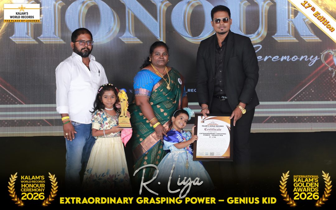Born on 01-01-2023 in Virudhunagar, Tamil Nadu, India, is Highly Appreciated for Her Exceptional Talent and Remarkable Grasping Ability Demonstrated Through the Identification and Recitation of the Following Body Parts 15, Vehicles 10, Number Words 10, Foods 20, School Object 12, Fruits 10, Vegetables 10, Shapes 8, Animals 10, Rhymes 5, Common Place 12, Alphabet Words 26, Tamil Words 12, National Leaders 10, Flowers 10, God Names 5, Week Days 7, Common Things 152. We Appreciate Her Outstanding Talent and Honour Her on Stage, Wishing Her Continued Success. This Achievement Was Accomplished on 05-11-2025 and Has Been Officially Recognized and Registered by Kalam’s World Records.