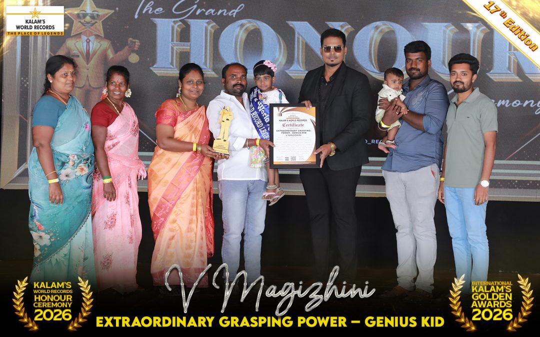 Born on 17-10-2022 in Coimbatore, Tamil Nadu, India, is Highly Appreciated for Her Exceptional Talent and Remarkable Grasping Ability Demonstrated Through the Identification and Recitation of the Following Thirukkural 1, Alphabet 26, Months 12, English Rhymes 1, Tamil Rhymes 4, Colours 12, Vehicles 12, Shapes 9, Fruits 21, Type of Tastes 6, Vegetables 30, Leaders 3, National Symbols 7, Flowers 7, Birds 14, Pet Animals 16, Traffic Signals 3, Professions 7, Hospital Things 11, Common Things 230, Total 432. We Appreciate Her Outstanding Talent and Honour Her on Stage, Wishing Her Continued Success. This Achievement Was Accomplished on 30-12-2025 and Has Been Officially Recognized and Registered by Kalam’s World Records.