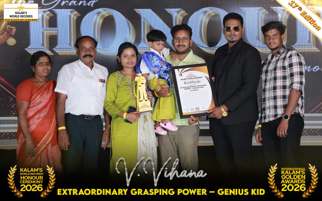 Born on 17-03-2023 in Cuddalore, Tamil Nadu, India, is Highly Appreciated for Her Talent and Remarkable Grasping Ability Demonstrated Through the Identification and Recitation of the Following Flowers 11, National Leaders 7, Shapes 5, Colours 10, Vegetables 13, Animals 15, Community Helpers 5, Transport 11, Action Words 18, Fruits 18, Body Parts 14, Planet 5, Alphabet 26, Phonics Sounds 26, Tamil Words 13, National Symbols 5, Opposite Words 5, Rhymes 2, Alphabet Phonics With Name 26, Common Things 162. We Appreciate Her Outstanding Talent and Honour Her on Stage, Wishing Her Continued Success. This Achievement Was Accomplished on 03-03-2026 and Has Been Officially Recognized and Registered by Kalam’s World Records.