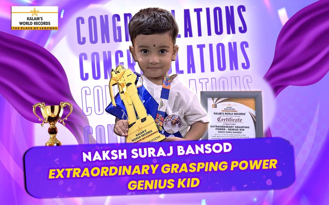 Born on 11-12-2023 in Wardha, Maharashtra ,India, is Highly Appreciated for His Exceptional Talent and Remarkable Grasping Ability, Demonstrated Through the Identification and Recitation of the Following Wild Animals – 22 Fruits – 27 Vegetables – 25 Body Parts – 20 Shape & Colour -20 Numbers – 20 Birds – 20 Baby Objects – 25 Baby Animals – 22 Actions – 36 Food – 18 Flowers – 20 Vehicles – 30 Opposites- 22 Things at Home – 40 Sea Animals – 15 Rhymes -10 Alphabet – 26 Kichen Utensils -19 Good Manners -20 Good Habits -22 Helpers/ People at Work-18 Farm Animals & Pets -21. We Appreciate His Outstanding Talent, Honour Him on Stage, Wishing Him Continued Success. This Achievement Was Accomplished on 30-03-2026 and Has Been Officially Recognized and Registered by Kalam’s World Records.