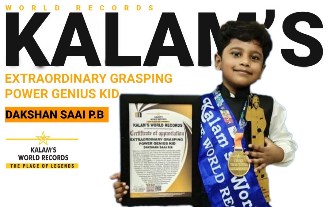 Born on 23-09-2017 from Coimbatore, Tamilnadu, India Is appreciated for his talent by Identifying, Reciting and also arranging Indian territory map with separate states, world map with major countries, tricolour flag by using vegetables, animals – 24, vegetables – 12, colours – 11, fruits in Hindi and English – 11, vehicles – 31, body parts – 25, birds – 22, insects – 20, shapes – 12, milk products – 8, slogan – 3, 7 continents of the world, weekday in Tamil and English, domestic animals in Hindi – 9, states of India, Alphabets in English, numbers 1-50, rhymes in Tamil – 5, rhymes in Hindi – 1, English rhymes – 7, uyir ezhuthukal – 13, national symbols – 12, rooms in a house – 6, exercise – 3. As we Kalam’s World Records appreciating his talent and honoring him in the stage of big applause and for his future stepping stone. Achievement Dated 15-10-2021. This achievement is registered in Kalam’s World Records.