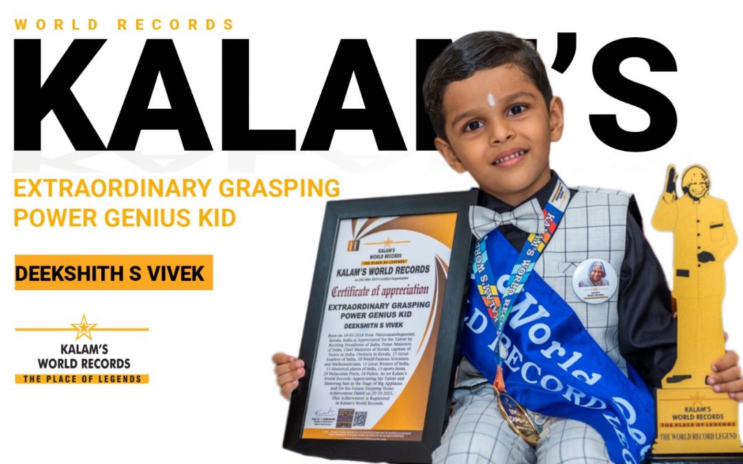 Born on 18-03-2018 from Thiruvananthapuram, Kerala, India is appreciated for his talent by Reciting Presidents of India, Prime Ministers of India, Chief Ministers of Kerala, capitals of states in India, Districts in Kerala,15 Great Leaders of India,20 world-famous Scientists and Mathematicians, 15 Great Women of India, 15 Historical places of India, 15 sports items, 29 Malayalam Poets,18 Fishes. As we Kalam’s World Records appreciating his talent and honoring him in the stage of big applause and for his future stepping stone. Achievement Dated 20-10-2021. This achievement is registered in Kalam’s World Records.