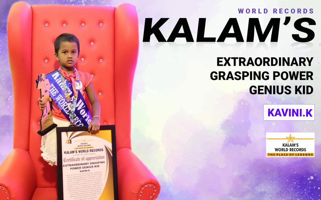 Born on 20-04-2018 from Thiruvallur, Tamilnadu, India is appreciated for her talent by Identifying and Reciting Thirukkural, 20 Consonants-12,Tamil months 12,English months 12, days in Tamil- 07,Days in English 07,Tamil rhymes- 08,English rhymes- 08, Hindi rhymes- 04,Colours- 10,26 Alphabets,Numbers- 01 to 30,Transports- 10,Fruits- 15,Vegetables- 15,Domestic animals- 10,Wild animals- 10,Body parts-15, Tamilnadu districts, India state and capitals.As we Kalam’s World Records appreciating her talent and honoring her in the stage of big applause and for her future stepping stone. Achievement Dated 05-01-2022. This achievement is registered in Kalam’s World Records.