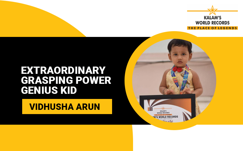 Born on 14-11-2019 from Trichy, Tamilnadu,India. She has created a new world record by Identifying and Reciting all Indian national symbols and India capital, food items, accessories, toys, electronic items, colors, furniture items, dresses, parts of the body, songs with music, animals by animal sound, and solving the puzzle of alphabets, numbers 1-10, fruits, vegetables, animals, birds, vehicle, flowers, shapes (basic and geometric shapes) and solving 8puzzle of 72 things within 13mins 58sec at the tender age of 1year and 7months. She set a new world record dated on 05-07-2021. This achievement is registered in Kalam’s World Records.