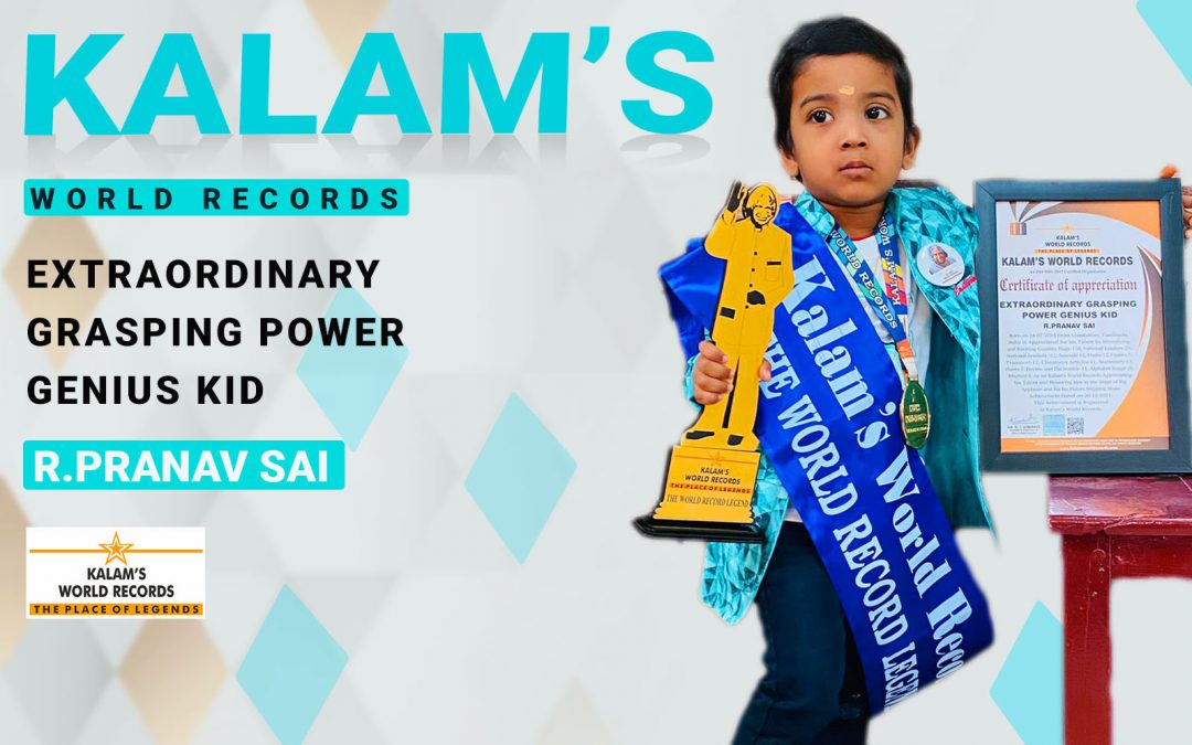 Fruits-12, Games-5, Transport-12, Classroom articles-11, Stationery-13, Plants-7, Electric and electronics- 11, Alphabet image-26, Rhymes 3. As we Kalam’s World Records appreciating his talent and honoring him in the stage of big applause and for his future stepping stone. Achievement Dated 30-12-2021. This achievement is registered in Kalam’s World Records.