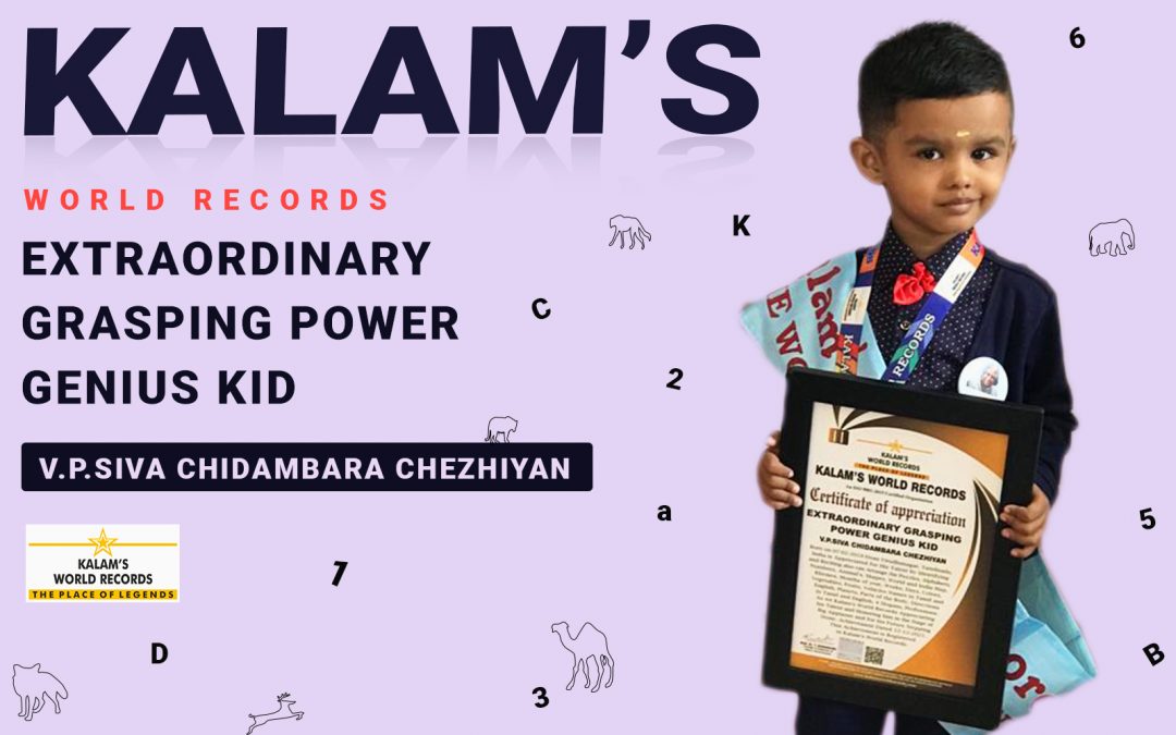 Born on 07-02-2019 from Virudhunagar, Tamilnadu, India is appreciated for His talent by Identifying and Reciting also can arrange the puzzles, Alphabets, numbers, animal’s, shapes, world and India map, Rhymes, months of year, weeks, days, colors, vegetables, fruits, Vehicles names in Tamil and English, planets, parts of the body, directions in Tamil and English, 4 Slogans, Professions. As we Kalam’s World Records appreciating his talent and honoring him in the stage of big applause and for his future stepping stone. Achievement Dated 12-12-2021. This achievement is registered in Kalam’s World Records.