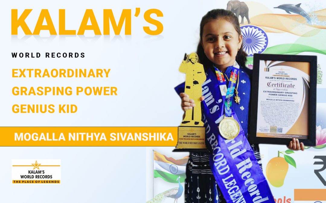 Born on 08-03-2018 from Hyderabad, Telangana, India is appreciated for her talent by Identifying and Singing singing National anthem, National song, 2 Annamacharya Kirthanas,1 Sri Ramadasu Kirthana,1 Telugu devotional song, singing 16 Sanskrit slokas, 30 opposite words, Animals and their younger one’s names- 25, National symbols of India -21, 43 domestic and wild animals, 15 water Animals,22 vegetables,28 fruits,21 birds,14 flowers,15 shapes, 12 colors in English,20 community helpers, Arranging India map puzzle, body parts, Months and weeks, Planets in English, Carnatic music. As we Kalam’s World Records appreciating her talent and honoring her in the stage of big applause and for her future stepping stone. Achievement Dated 27-02-2022. This achievement is registered in Kalam’s World Records.
