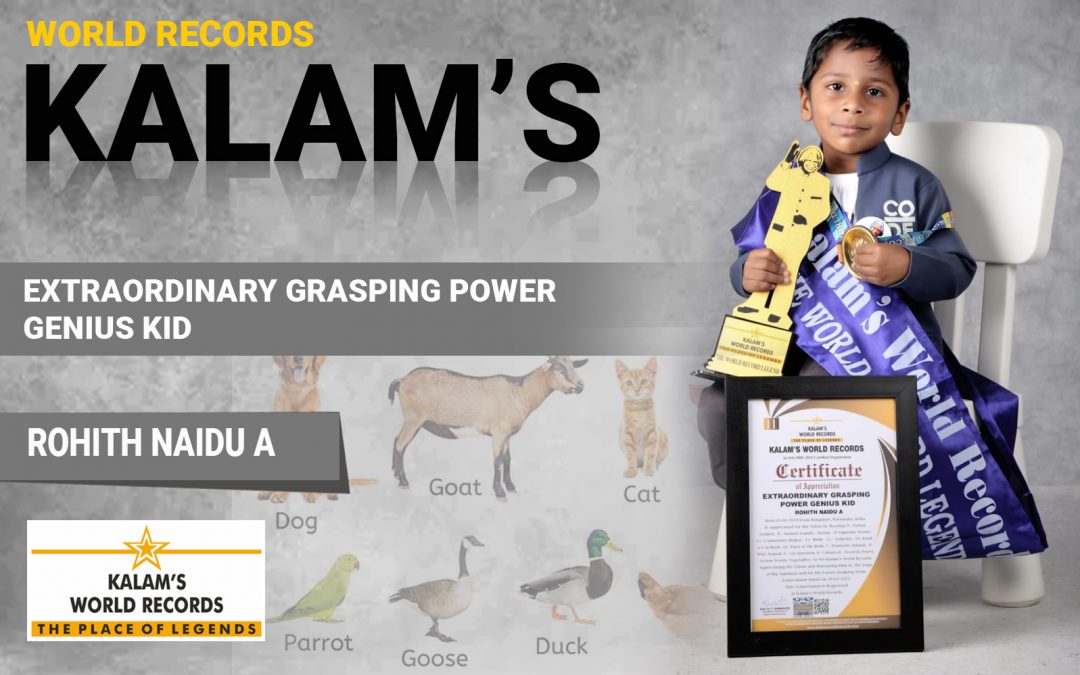 Born on 03-09-2019 From Bangalore, Karnataka, India Is Appreciated for His Talent by Reciting 9 -nation Symbol, 8 -animal Sounds ,saying-10 Opposite Words,12- Community Helper, 11-birds, 11-vehicles, 16- Food, A-Z in Book, 16- Parts of the Body 7 -domestic Animal, 9 -wild Animal, 6 -GK Question, 8 – colors, 8 -festival, Fruits, Action Words, Vegetables. As We Kalam’s World Records Appreciating His Talent and Honoring Him in the Stage of Big Applause and for His Future Stepping Stone. Achievement Dated on 28-03-2022.