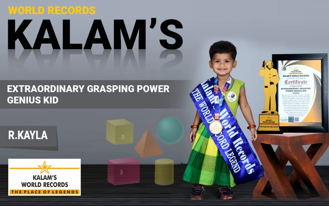 Born on 22-06-2020 From Coimbatore, Tamilnadu, India Is Appreciated for Her Talent by Identifying 14 Fruits , 6 Vegetables, 5 Birds, 1nuts, 9 Animals, 1 Flower, 5 India Leaders,13 Parts of Body, 95 Things That She Use Her Day Today Activity,shape-8, Colours-10, Alphabet-6, Food Items-13, Relationship-5, Bathroom Essentials Things-8, Sounds -5. As We Kalam’s World Records Appreciating Her Talent and Honoring Her in the Stage of Big Applause and for Her Future Stepping Stone. Achievement Dated on 20-03-2022.