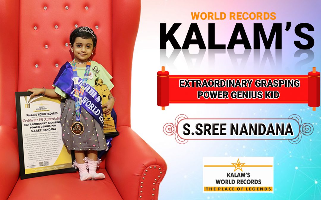 Born on 29-06-2019 From Chennai, Tamilnadu, India Is Appreciated for Her Talent in Identifying and Reciting 40-famous Personalities, 20- Shapes, 22- Colors, 24- Animals, 27- Flowers, 33 – Birds, 7- Continents, 25- Words, a to Z Phonic Sounds Plus Corresponding Words, 7- Days of the Week, 12-months of the Year, 7-wonders of the Words, 12- Solar System, 40- Fruits, 40- Vegetables, 10- Dry Fruits & Nuts, 34- Body Parts, 27- Action Words, 20- Numbers, 37- Vehicles, 5- Sanskrit Slogans. We, Kalam’s World Records, Are Appreciating Her Talent and Honoring Her With Big Applause as a Stepping Stone for Her Bright Future. Achievement Dated 22-04-2022.