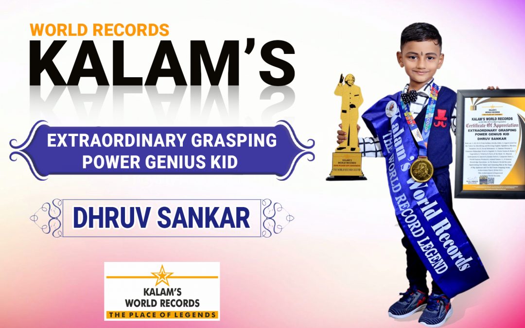 Born on 11-06-2019 From Kollam, Kerala, India Is Appreciated for His Talent by Identifying and Reciting English Alphabets, Rhymes, Numbers 1 to 10, Social Reformers -4, Famous Persons-3, Translate Malayalam Word to English-35, Fruits Names-8, Birds-7, Vegetables-6, Vehicles-9, Part of the Body 10, Musical Instruments-8, Insects-8, Kerala Poets-8, Computer Parts-3, World Famous Women-8, Animal Names-11, 6 General Knowledge Questions. As We Kalam’s World Records Appreciating His Talent and Honoring Him in the Stage of Big Applause and for His Future Stepping Stone. Achievement Dated 20-04-2022. This Achievement Is Registered in Kalam’s World Records.